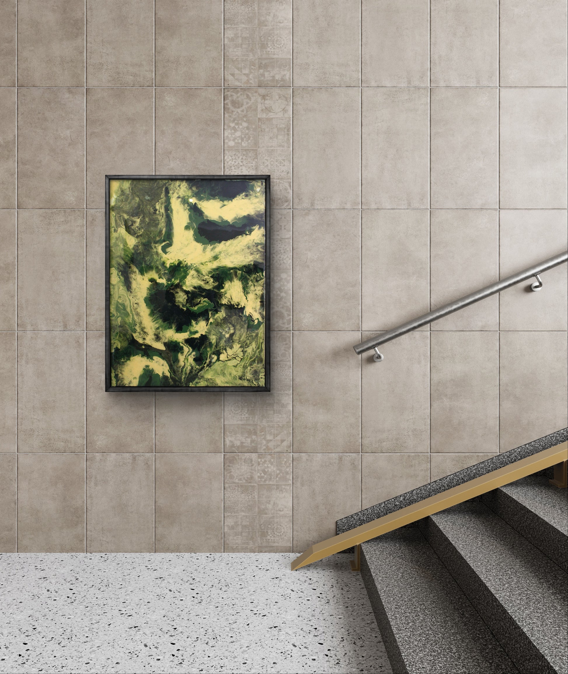 As I created this piece, I wanted to capture the grounded energy of the earth — its depth, movement, and quiet strength. The deep greens and golden tones reminded me of rivers carving through valleys or molten gold flowing into shadowed caverns. The interplay between light and darkness gives the work a sense of drama, yet it remains deeply rooted, almost like the pulse of the land itself.